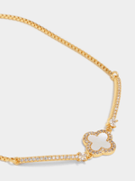 Expertly crafted in 14ct Gold Plated Brass Base Metal, this elegant slider bracelet features a mop Clover pendant glittering with pavé set Cubic Zirconia.