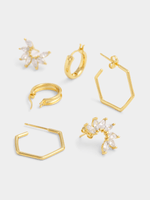 Expertly crafted in 14ct Gold Plated Brass Base Metal, this stylish set includes octagonal as well and round hoop earrings and stud earrings glittering with marquise-cut Cubic Zirconia. These earrings feature hypo-allergenic posts and stoppers for sensitive skin.