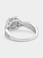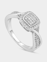Expertly crafted in Sterling Silver, this beautiful ring features a cushion-shaped cluster of round-cut Created White Sapphires including Earth Grown Diamond accents in a halo setting and an elegantly twisted band glittering with pavé set stones. The total Diamond weight is 0.01 carats.