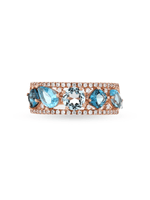 A ring that captures the beauty of the ocean in all its shades. This ring is set in 9ct rose gold with blue topaz in all its hues, and complimented by 0.25ct white diamonds