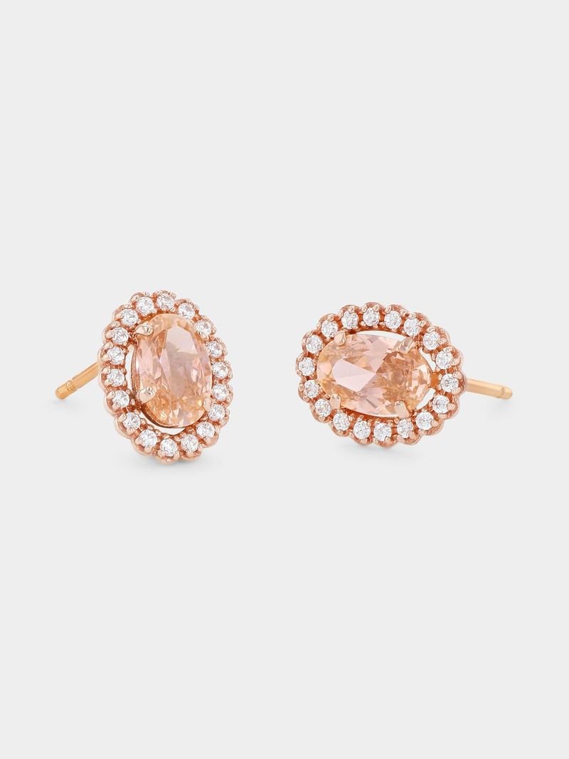 Expertly crafted in 9ct Rose Gold, these elegant stud earrings feature oval-cut pink Cubic Zirconia embraced by a halo of white stones.