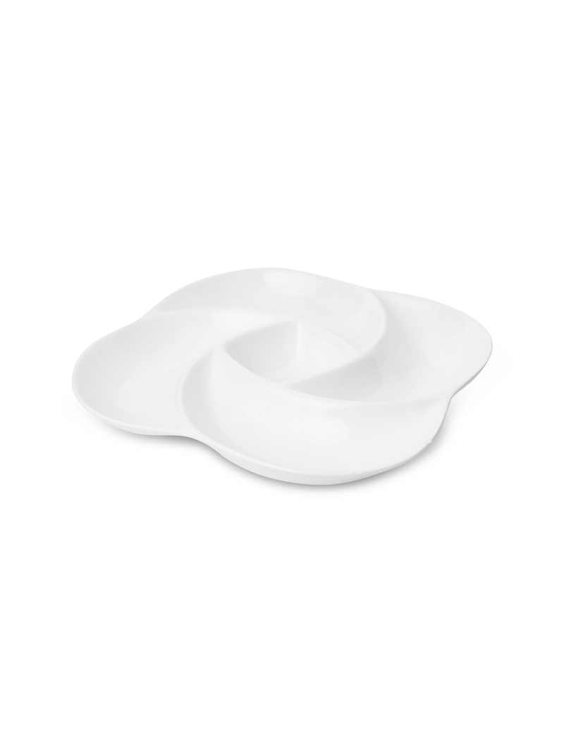 Serve a variety of snacks with the @home Lacasa divided plate in white. This curved plate offers a centre bowl surrounded by four outer sections ideal for holding everything from delicious dips to nuts, crudites, fruit or really anything you can imagine.