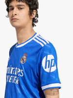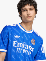 At home in blue. This Real Madrid third jersey comes in a hue that's close to the hearts of Madridistas and 3-Stripes fans. A classic adidas Originals colourway and a subtle nod to the Bernabéu's identity, it's the perfect shade to celebrate the ultimate football partnership. Serrated 3-Stripes and a Trefoil add extra adidas heritage. Moisture-managing AEROREADY keeps fans focused.