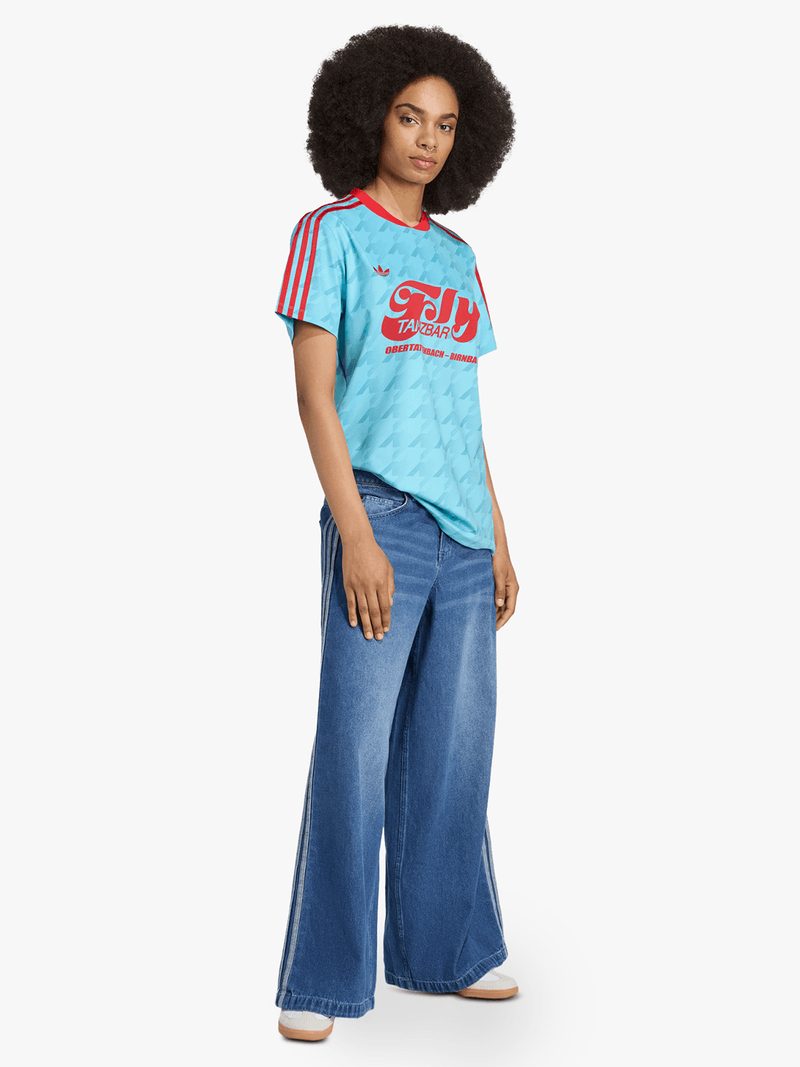 This jersey from adidas lets you celebrate your love of football in bold fashion. The relaxed shape teams up with soft interlock fabric to keep you comfortable whether you're cheering on your favourite team or kicking back at home. An oversized front graphic and subtle allover print pay tribute to the beautiful game. Supplier style is (JW2771).