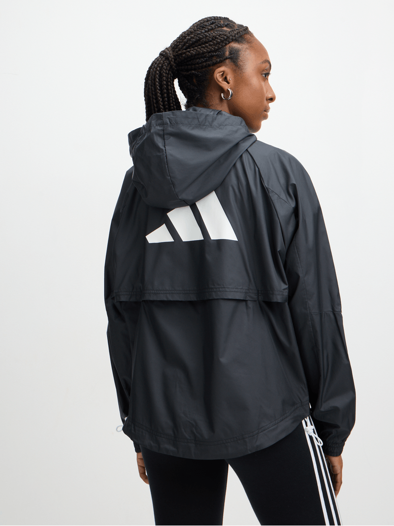 Head to the gym or dance class in this adidas windbreaker that lets you take on wind and light rain without missing a beat. Loose-fitting and sporty, it features mesh panels for breathable comfort. Batwing sleeves and a curved, drawcord-adjustable hem add stylish appeal.