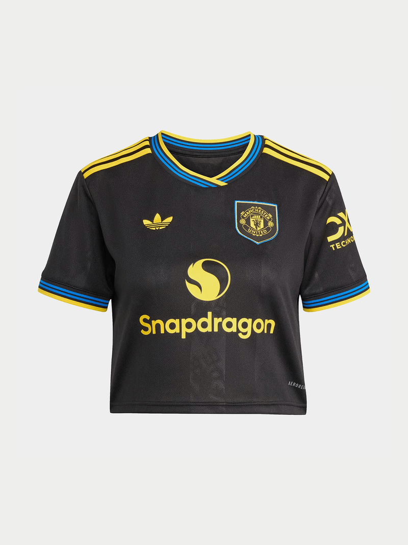 Part of a clean, classic adidas kit that will transport fans to a golden era. Finished in black, this cropped Manchester United third jersey conjures some of the club's most iconic players and memorable away performances. A yellow Trefoil and club badge stand out on the chest while more subtle, devilish details are woven into the fabric. Moisture-managing AEROREADY keeps fans comfortable while their team creates new football memories.
