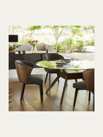 Locally manufactured to the highest standards in a modern yet classic design, the Alba dining chair offers an inviting seat that encourages lingering at the table long after the meal is served. Fully upholstered in a richly textured woven fabric with a curved back, tapered solid wood legs, and full-grain leather back detail, Alba brings a sophisticated feel to your home.