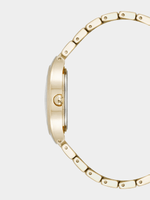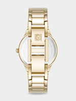 This watch showcases a sleek round case with a striking black glossy dial embellished with pearling indices that catch the light beautifully. The gold tone band perfectly complements the overall design, making it a chic accessory for any occasion.
