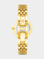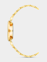 This gold-tone watch features a sleek black dial with bold Roman numeral markers for a look that’s both timeless and striking. The polished bracelet adds a touch of shine, making it a perfect choice for everyday elegance or evening sophistication.