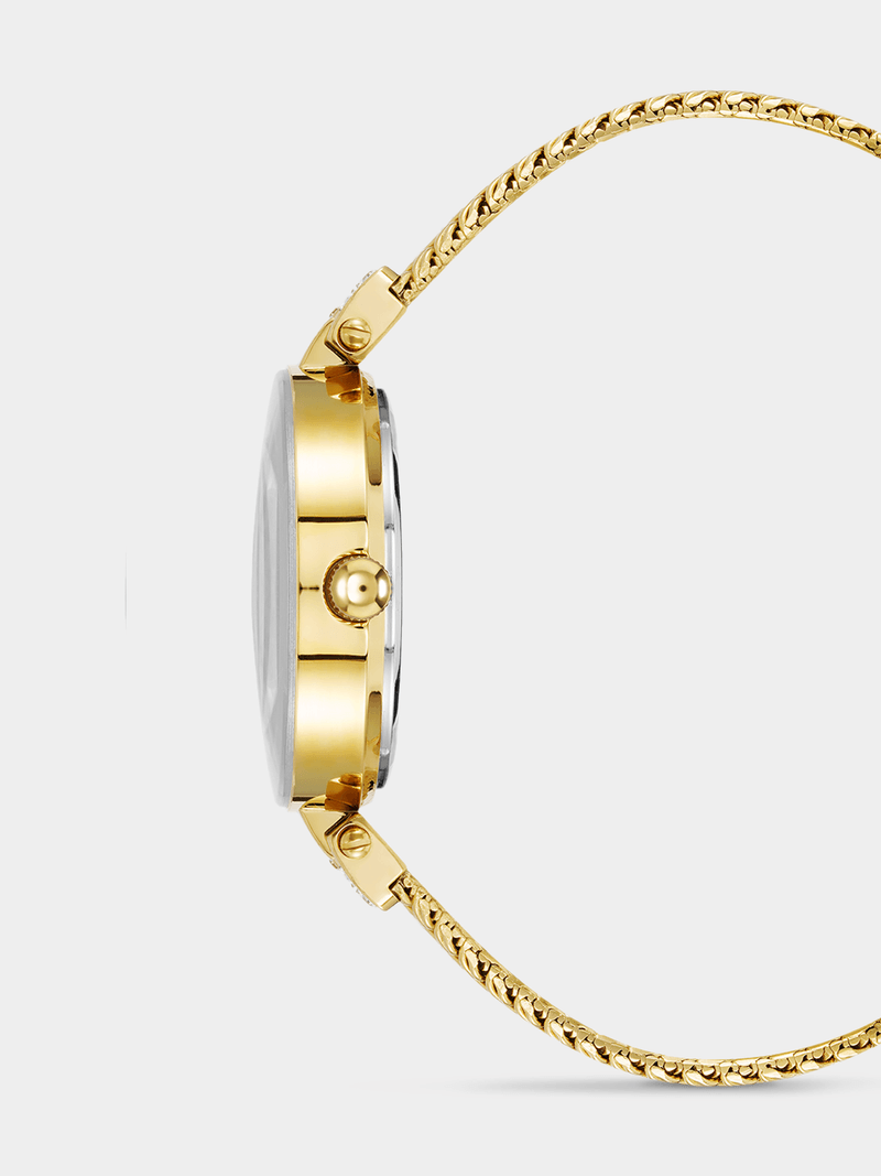 A perfect balance of elegance and sparkle, this timepiece shines with crystal accents and a sleek gold tone mesh band. With its luxurious metal tones and eye-catching black dial, it brings timeless sophistication to every moment.