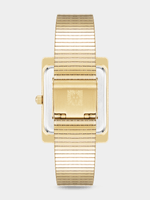 This Anne Klein watch is a sophisticated take on modern style. It features a sleek gold-tone rectangular case and a black dial with stick indexes. The matching bezel complements the stainless steel mesh band, adding a refined touch to your look: an adjustable buckle closure and splash resistance perfectly balance functionality and elegance.