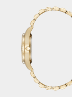 A gold tone round case encircles the dial with an intricate flower pattern, bringing a touch of nature’s beauty to the watch design. The gold tone band completes the look, adding a refined touch to this elegant timepiece.
