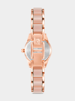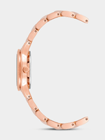 Soft and feminine, this rose gold-tone bracelet watch features a light pink dial with a subtle sunray finish. The polished blush links and classic round case create an effortlessly elegant look, perfect for everyday wear or a gentle pop of color.