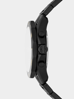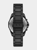 Bold in black. This street-smart chronograph watch commands attention with a rugged 44mm stainless steel case, textured black dial and a sturdy stainless steel bracelet. Water resistant to 100 meters, the functionality extends beyond looks. Elevate your style game.