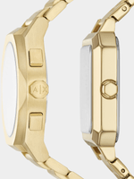 This gold-tone pair set is the perfect gift, combining two stainless steel watches delivering modern versatility with a sleek edge. For Him: The brushed gold dial features a subtle CD finish that adds dimension, complemented by a polished round case and bracelet. Clean chronograph sub-dials enhance its functionality, creating a seamless balance between practicality and street-inspired design. For Her: A sleek rectangle case pairs seamlessly with the high-shine gold-tone bracelet for an understated, modern look. The sunray gold-tone dial catches light beautifully, highlighting its minimalist three-hand design.