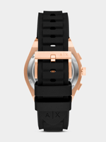 A sleek pairing of texture and contrast, this chronograph features a matte black dial framed by a rose gold-tone stainless steel case. The black silicone strap adds a modern, athletic edge, balancing the polished finish of the case. Sub-dials bring precision and functionality, keeping the design sharp and streamlined.