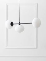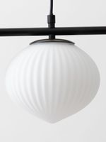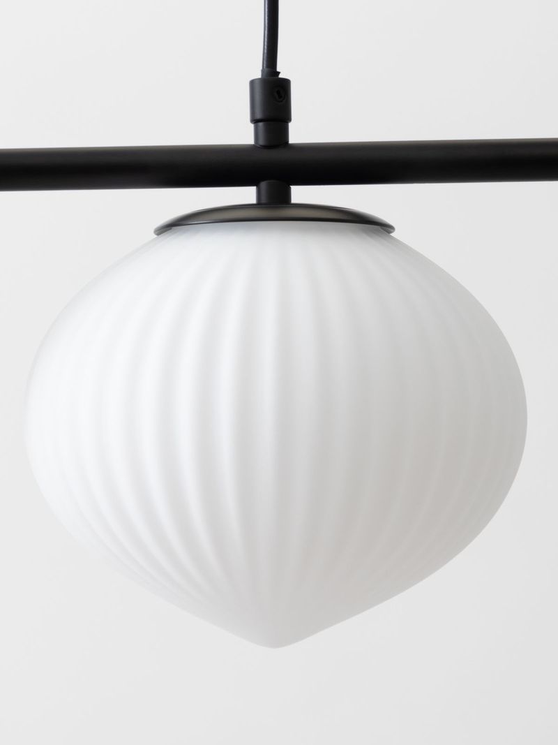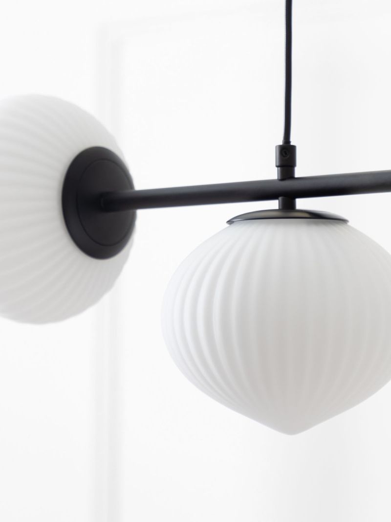 Update any room with the on-trend Asymmetrical Japandi Ceiling Pendant. Three antique-style Japanese-inspired frosted glass shades with fluted detail are suspended from modern matte black metal arms in an asymmetrical arrangement for a contemporary look. Use this striking fitting to anchor your living room, bedroom or kitchen.