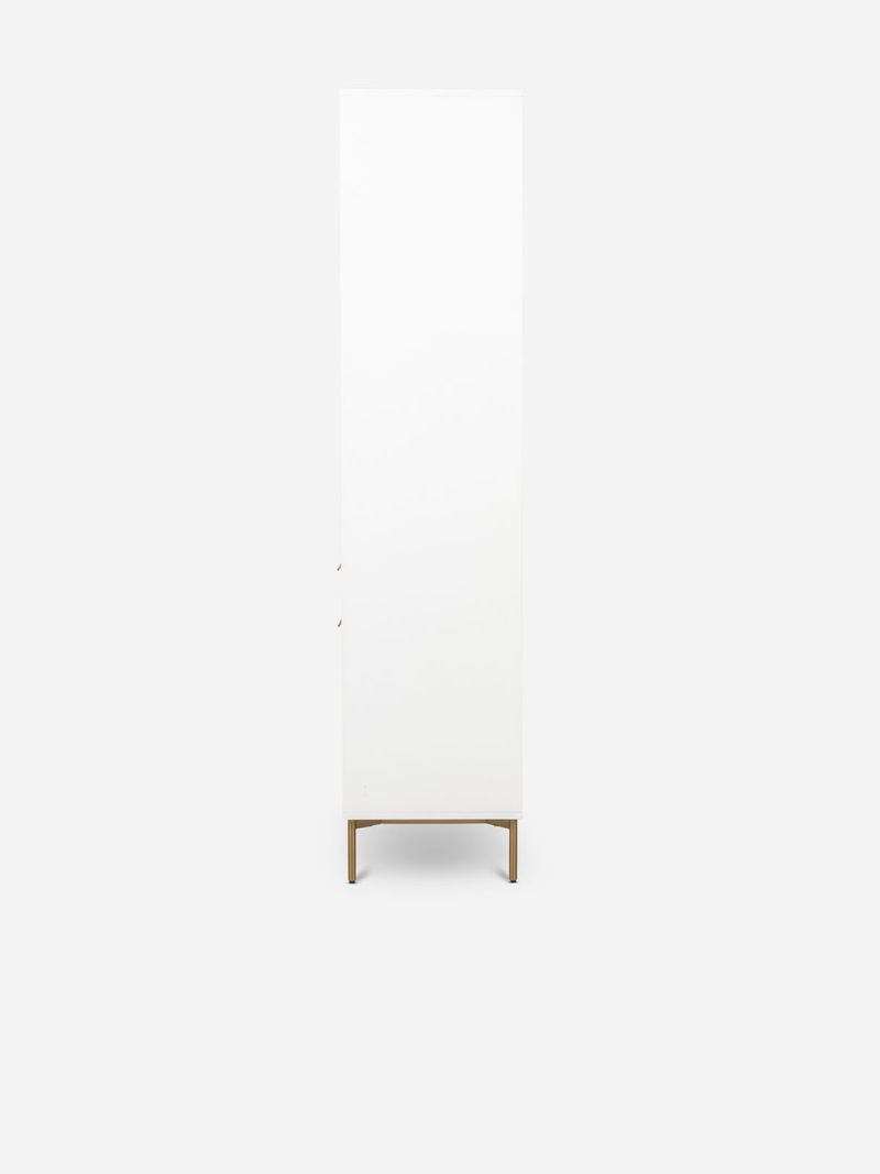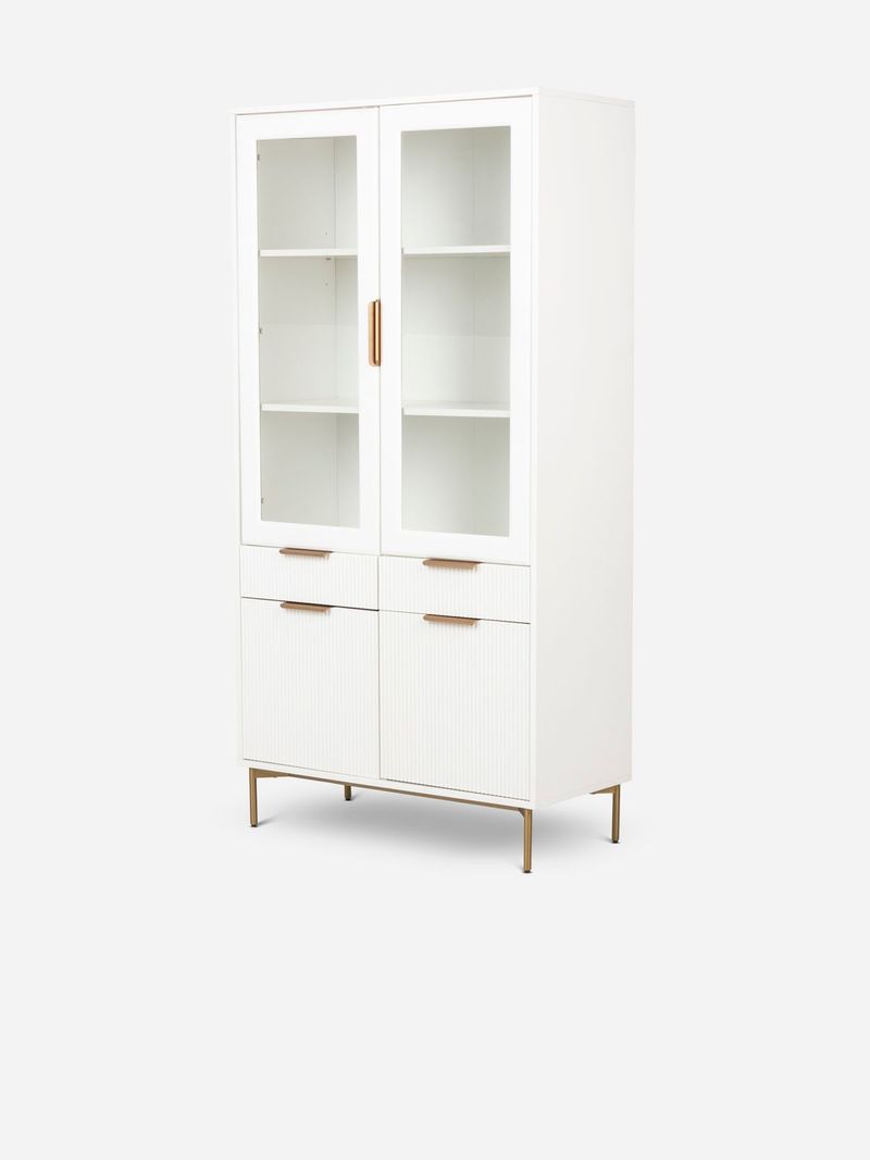 The Aura Cabinet with fluted detail is a stylish addition to any living or dining room. Made of lacquered MDF & veneer with nickle-plated brass legs & handle, and tempered glass. Add a touch of elegance to your home with this functional piece.