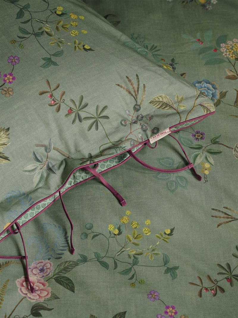 Designed by Amsterdam-based PIP Studio, whose philosophy is 'a world full of hidden designs and details,' this charming Bedding House Bustani Duvet Cover Set features intricate floral patterns combining graceful branches, fantasy flowers, berries, and leaves with subtle geometric side panels and a piped finish for an extra luxurious look. With a unique print on both sides and a pretty tie closure, the cushions and duvet can be used on both sides.