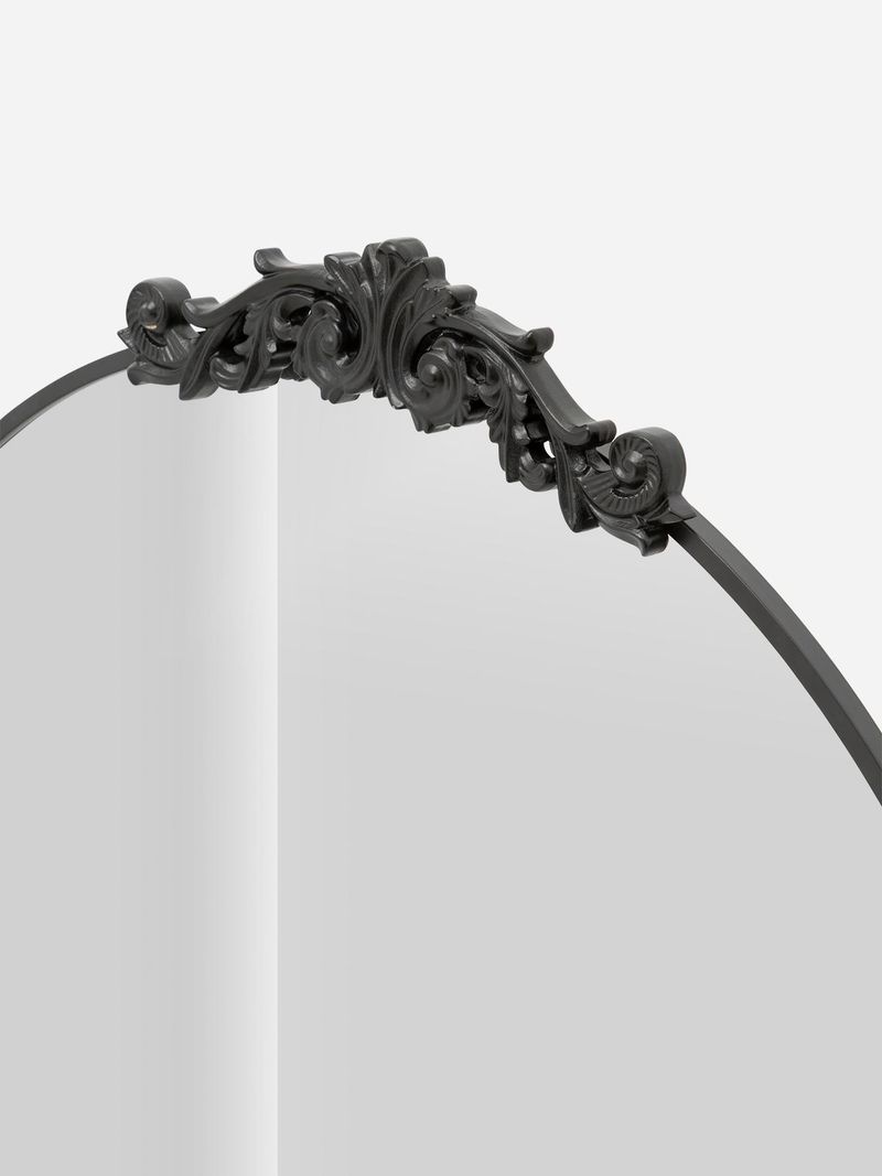 Feminine and detailed, the Belle Round Mirror in Black features a slim metal frame with an elegant filigree detail at the top. The round shape keeps the look modern while the antique-style detail has timeless appeal. Perfect for adding interest above a console, mantel, or dresser.