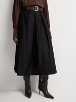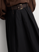 Make a statement in our Belted Pleated Maxi Skirt. The wide pleats and maxi length give a vintage-inspired look. Pair it with a blazer and ankle boots.