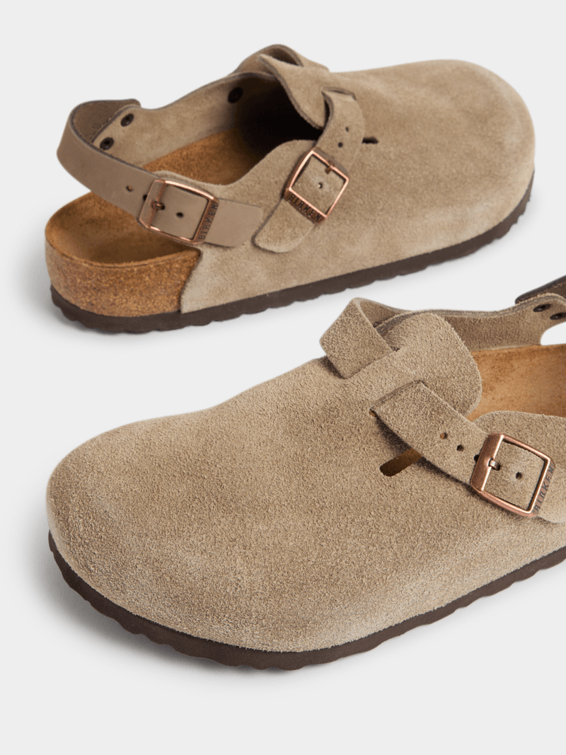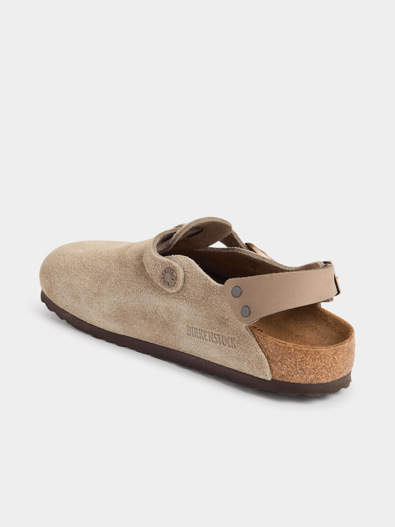 The BIRKENSTOCK Tokio clog is a variation of the classic Boston. The model is characterized by its ankle strap and can easily be worn any time of the year. The upper is made from especially soft suede which hugs the foot like a second skin.(Supplier Style:1028287_ARC)