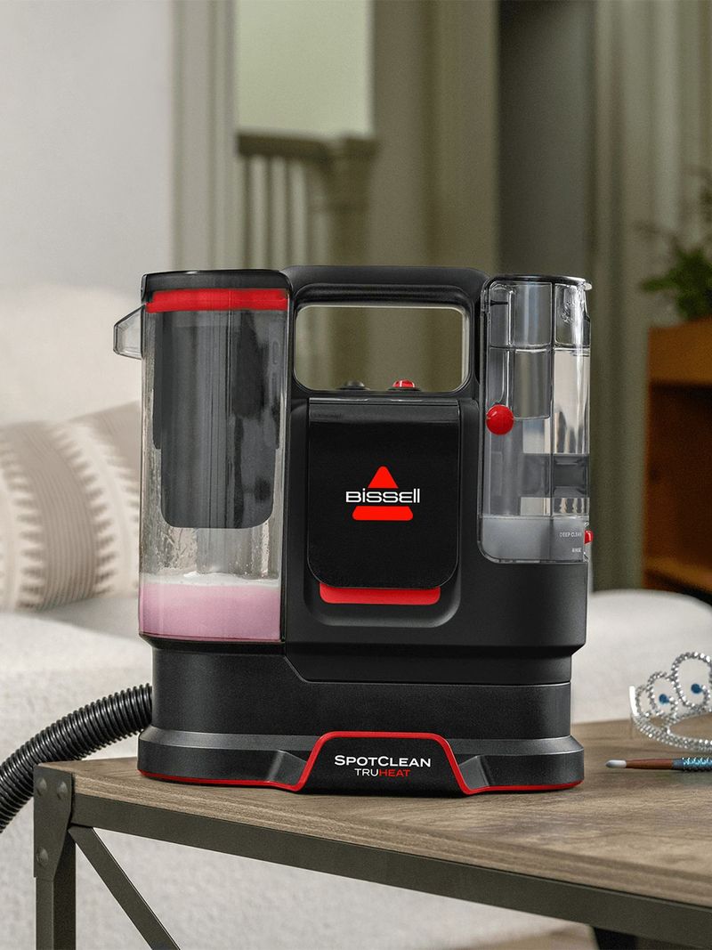 Effectively remove set-in spots and stains with the Bissell SpotClean TruHeat Carpet & Upholstery Cleaner. Compact with a slim design which is easy to move, carry and store, it features TruHeat™ Technology, which heats and maintains constant water temperature throughout the cleaning process. The 1.7m hose lets you get to those small, hard-to-reach areas. Four specialised cleaning tools, along with strong spray and suction, help to remove even the toughest stains. The dual tank technology system features two separate tanks for clean and dirty water, and removable tanks for easy filling and emptying. This compact cleaner is perfect for stairs, upholstery, area rugs and car interiors.