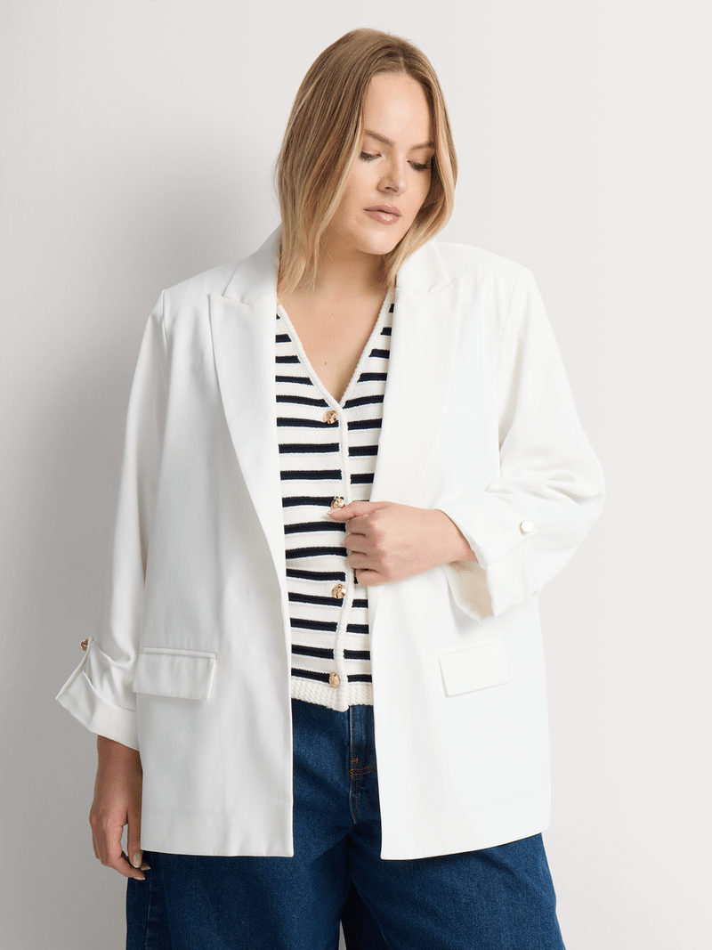 Add our Relaxed Fit Tab Sleeve Blazer to your jacket collection. The relaxed fit makes it the perfect addition to any outfit. Wear it with a cami top and wide-leg denim, or with a column-fit maxi dress and heels.