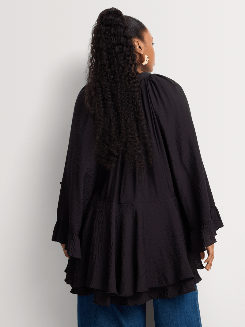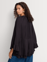 Our Neck Tie Detail Longline Blouse makes a statement with its bold, voluminous cut and flowy, lightweight feel. Wear it with fitted bottoms for a balanced silhouette, or opt for wide-leg pants for a statement look.