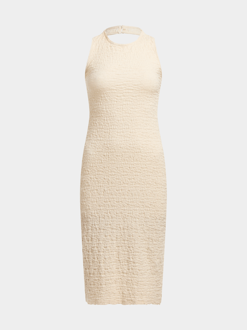 Our Textured Halterneck Bodycon Midi Dress is the perfect summer pick. Made from a textured cotton blend in a fitted bodycon style, slip it on after a long day on the beach and step effortlessly from day to night. Add a woven handbag to complete the look.