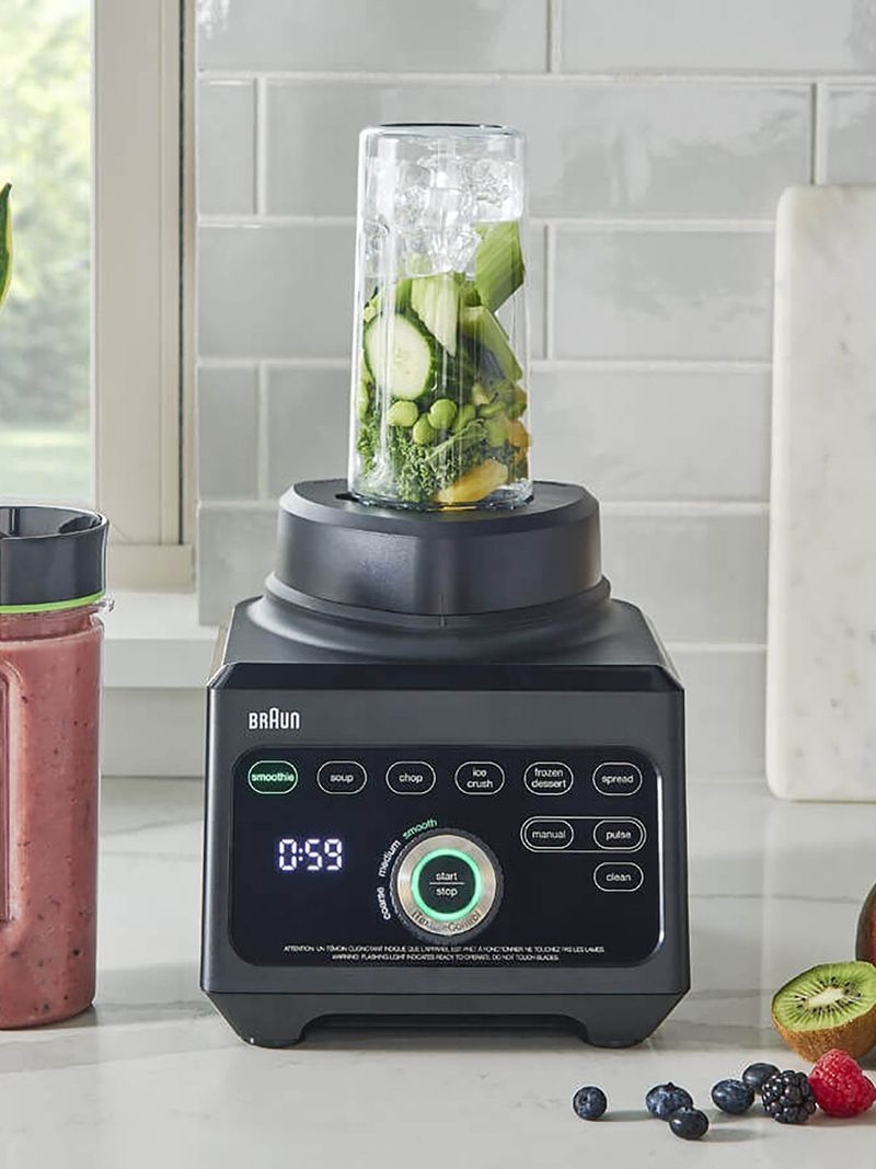 Elevate your food prep with the Braun PowerBlend 9 Jug Blender. iTextureControl lets you choose texture with each program, while you perfect your dish down to the finest detail with 18 blender settings, 6 automated food programs and 3 texture settings. TriAction Technology gives you a 60% finer and 4 x faster blend while the powerful high-speed motor allows for less pre-cutting. The PrecisionCrush blade ensures optimal blending circulation and consistently great blending results over a long period of use. Perfect for warm foods, the hot soup function brings ingredients to hot serving temperature through the friction of the blade in the heat-resistant jug. Take smoothies to go with the two 600ml BPA-free bottles, made from Tritan plastic which are shatterproof, odour and taste resistant.