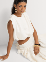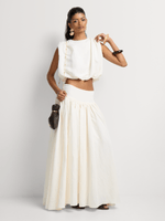 Elegant and chic, the Luella Bubble Hem Top pairs perfectly with the matching Full Maxi Skirt. Add flats and an elegant handbag.