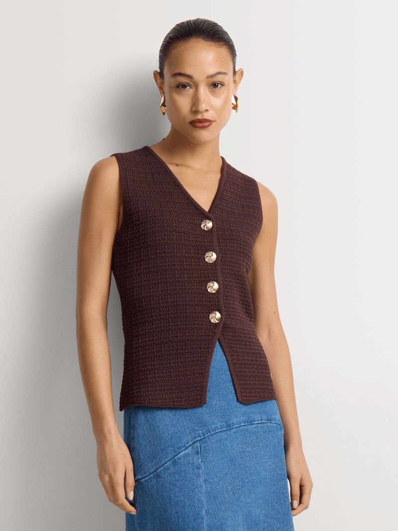 Knitted tops are a style staple this season. Wear our Button Through Knit Vest with smart wide-leg trousers and block heels to the office, or with a pleated maxi skirt and flats on the weekend.