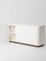 With its clean lines and smooth curves, the Calista Sideboard brings a quiet luxury to your living space. The satin-finish lacquered body feels fresh and sophisticated, complemented by a blonde wood-look base.