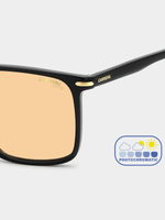 Carrera presents the 366/S sunglasses as a bold rectangular silhouette that embodies the brand's timeless spirit with a contemporary twist. Crafted using premium black acetate, this ultra-slim construction is defined by a flat brow line and subtle gold metal accents at the front and Carrera lettering at the temples for a luxurious contrast. The fitted orange photochromic lenses adjust to varying light conditions and are finished with an anti-reflective coating on the inside for an exceptional wearing experience.