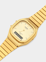 This retro-modern Gold Plated Stainless Steel bracelet watch features a square case with rounded edges and gold toned anadigi dial.
