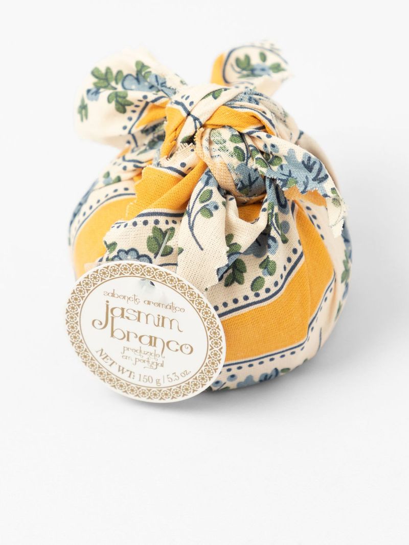 The Castelbel Chitas Soap in White Jasmine Yellow is a charming addition to a gift. This round soap is scented with delicate floral Jasmine, then coined and hand-wrapped with care in traditional chita cloth.