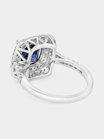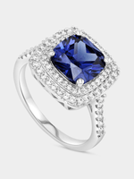 Expertly crafted in Sterling Silver, this beautiful ring features a cushion-cut sapphire blue Cubic Zirconia embraced by a double halo of round-cut white stones and a band glittering with pavé set stones.