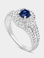 Expertly crafted in Sterling Silver, this beautiful ring features a round-cut sapphire blue-coloured Cubic Zirconia embraced by a double halo of white stones and a band glittering with pavé set stones.