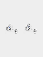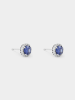 Expertly crafted in Sterling Silver, these beautiful stud earrings feature round-cut Tanzanite blue Cubic Zirconia embraced by halos of white stones.