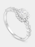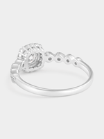 Expertly crafted in Sterling Silver, this beautiful pre-engagement ring features a round-cut Cubic Zirconia embraced by a cushion-shaped halo and a vintage-style band glittering with pavé set stones.