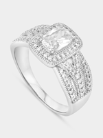 Expertly crafted in Sterling Silver, this alluring vintage-style ring features a cushion-cut Cubic Zirconia in a halo setting and an intricately beaded band glittering with pavé set stones.