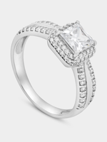 Expertly crafted in Sterling Silver, this beautiful ring features a cushion-cut Cubic Zirconia in a halo setting and a band glittering with pavé set stones.
