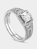 Expertly crafted in Sterling Silver, this vintage-style twinset ring features a cushion-cut Cubic Zirconia in a halo setting and intricately beaded bands glittering with round-cut and tapered baguette-cut stones.
