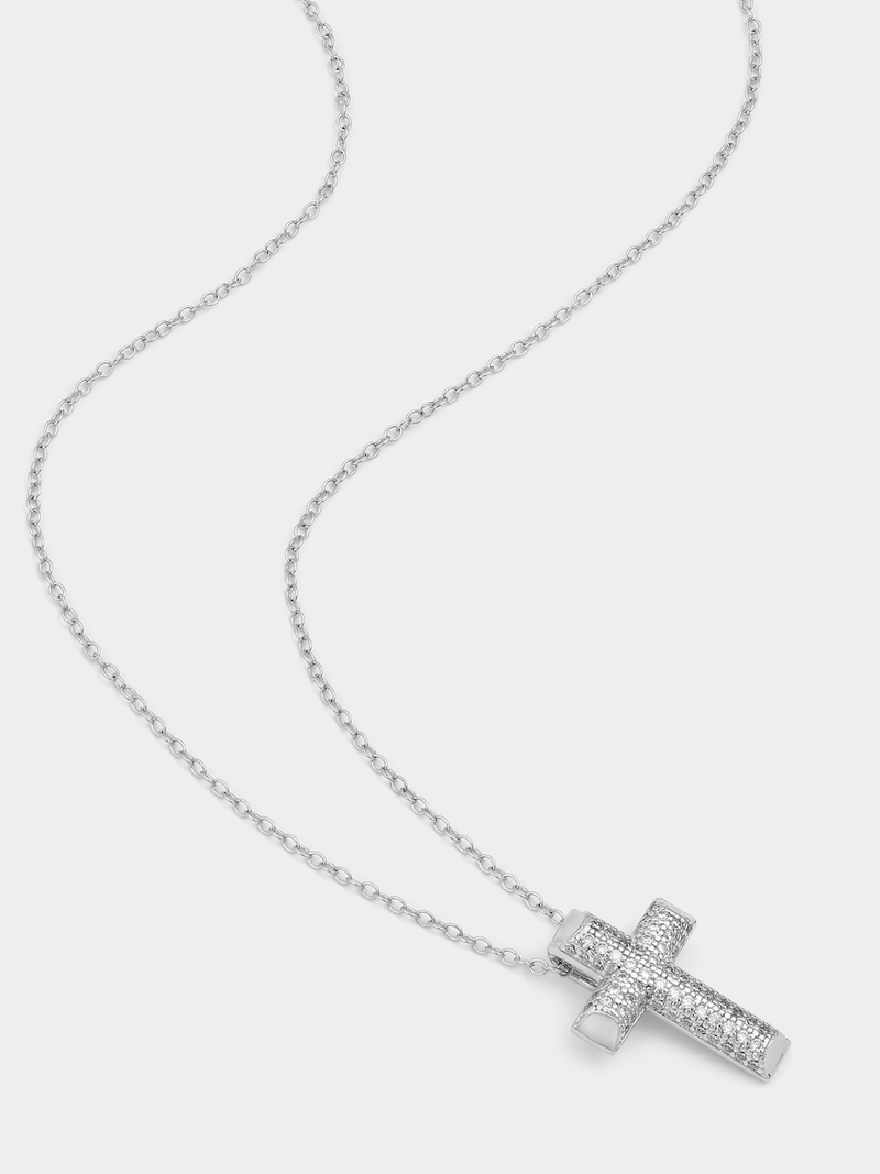 Expertly crafted in Sterling Silver, this beautiful cross pendant on a chain glitters with pavé set Cubic Zirconia.