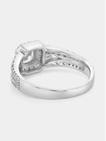 Expertly crafted in Sterling Silver, this vintage-style ring features a princess-cut Cubic Zirconia in a halo setting and an intricately detailed split-shank band sparkling with pavé set stones.