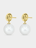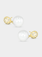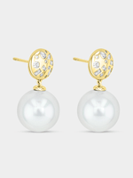 Expertly crafted in Sterling Silver, these elegant drop earrings feature lustrous Shell Pearls and glitter with pavé set Cubic Zirconia.