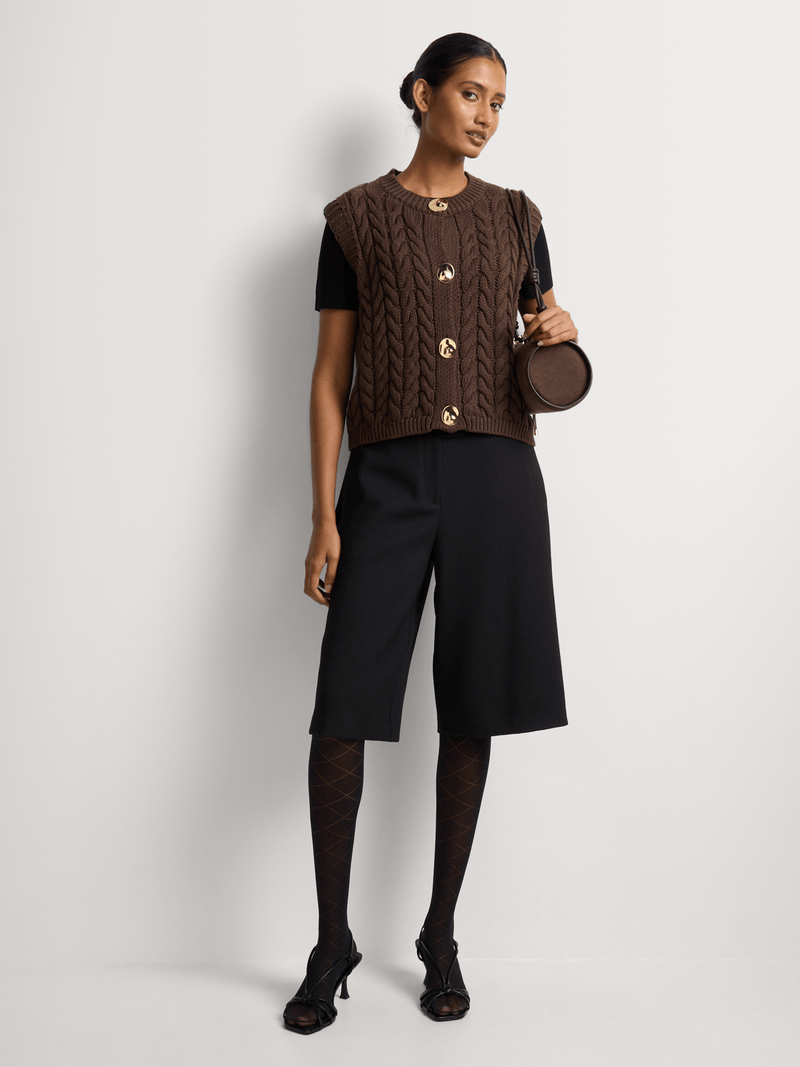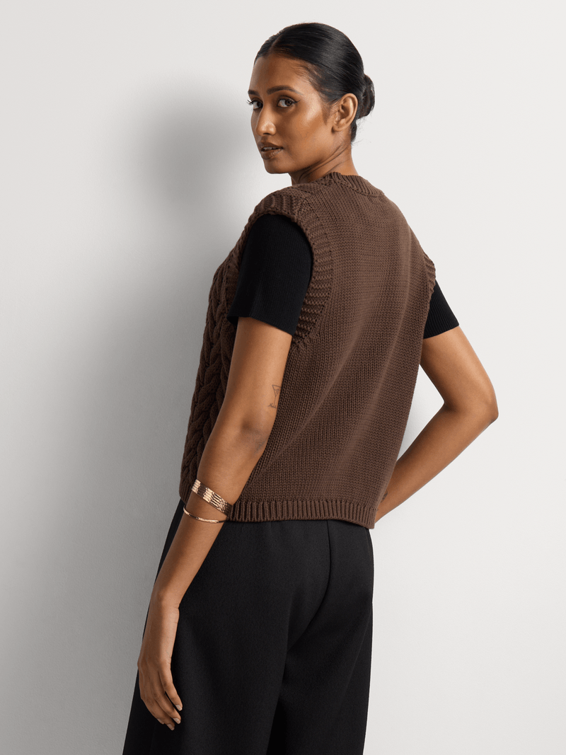 Our Chunky Knit Button Through Vest is made from a breathable 100% cotton yarn in an on-trend chunky knit style. Wear it with smart trousers and boots to the office, or with a midi skirt and heels for a different take.