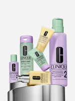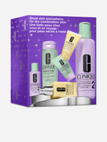 Clinique’s signature 3-Step Skin Care System for healthy-looking skin—one set for home, one for travel. Customized for drier skin types.