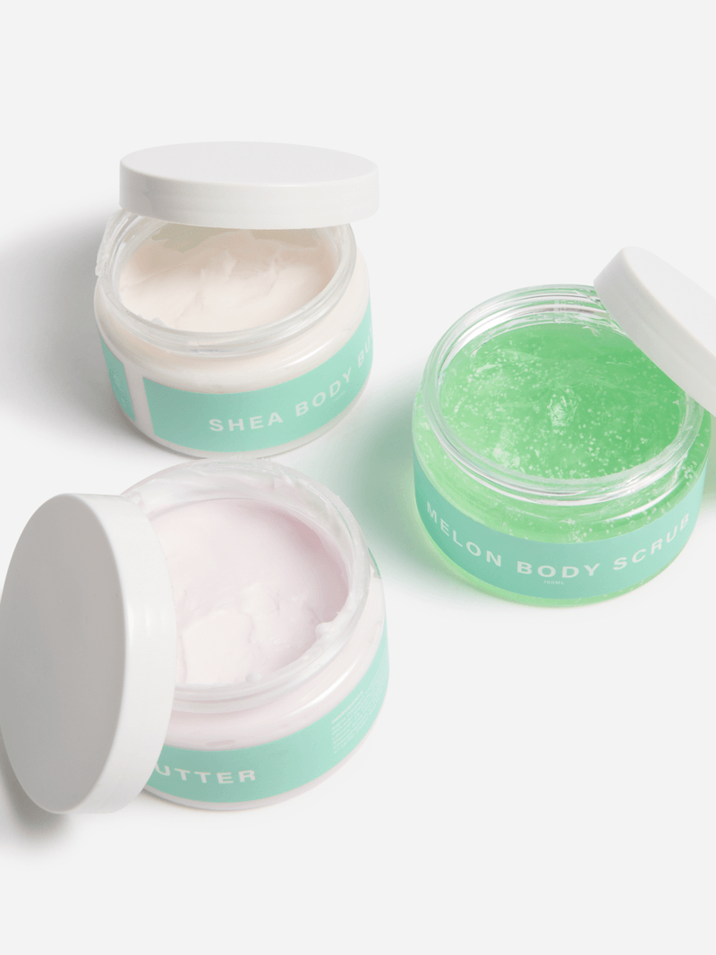 Melon body scrub 100ml:Apply to skin in the shower. Massage gently, then rinse.
